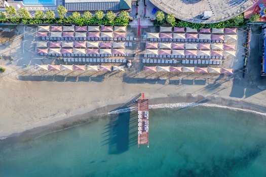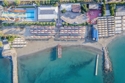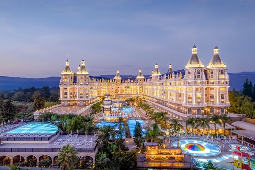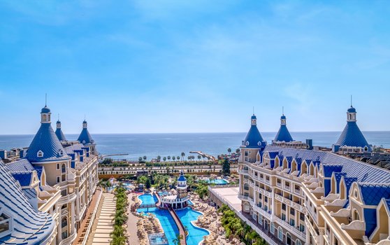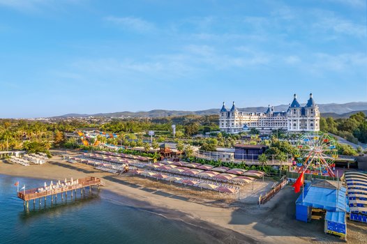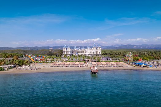 Этот отель расположен в районе Тюрклер и подойдет для семейного отдыха. Гости размещаются в семиэтажном здании с восточным архитектурным стилем. Номера просторные и светлые, предлагаются как стандартные, так и семейные варианты. Отельный пляж отмечен наградой «Голубой флаг» и находится через дорогу. До него можно дойти через подземный переход. Площадь пляжа составляет 5,460 м², берег песчано-галечный, а море чистое и спокойное. На пляже установлены душевые, кабинки для переодевания, есть зона с шезлонгами и зонтиками, ресторан с закусками и напитками, амфитеатр, аквапарк с 9 горками для взрослых и 5 горками для детей, а также надувной аттракцион Wet Bubble. На территории отеля расположены большой открытый бассейн (1793 м²), инфинити-бассейн и полуолимпийский крытый бассейн. Питание организовано по системе «ультра все включено». Основной ресторан предлагает блюда турецкой и европейской кухни в формате шведского стола. Дополнительно работают 4 ресторана а ля карт, 2 снэк-ресторана и 6 баров. В главном ресторане есть отдельный детский зал со шведским столом, подогреватели для бутылочек и высокие стульчики. Для детей предусмотрен клуб с занятиями по живописи, тематическими играми и спортивными соревнованиями. Рядом находится бассейн для малышей и игровая площадка на свежем воздухе. Вечером для детей устраивают мини-диско. Родителям по запросу предоставляются услуги няни и аренда детских колясок. Взрослые могут заниматься пляжным волейболом, бочча, теннисом, ходить в турецкую баню, сауну, посещать массаж и СПА-процедуры, а также заниматься в фитнес-зале. В бассейне проводят занятия по аквааэробике. Вечерняя программа включает развлекательные шоу, дискотеки, пенные вечеринки и файер-шоу. На всей территории отеля доступен бесплатный Wi-Fi. Если гость остановится в этом отеле, утро начнется с завтрака в ресторане, после чего можно отправиться на пляж. Чистая вода и мягкий песчаный берег идеально подойдут для отдыха у моря. Дети наслаждаются аттракционами в аквапарке, пока взрослые расслабляются в СПА или играют в пляжный волейбол. Днем можно перекусить в снэк-ресторане или отдохнуть у бассейна. Вечером вся семья может поужинать в одном из ресторанов с блюдами международной кухни, а затем отправиться на развлекательное шоу или дискотеку. За пределами отеля в шаговой доступности находятся магазины, рынок и автобусная остановка, откуда легко добраться до Аланьи и других близлежащих достопримечательностей, таких как аквапарк Sealanya и Щаравсинский Каравансарай.