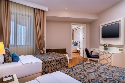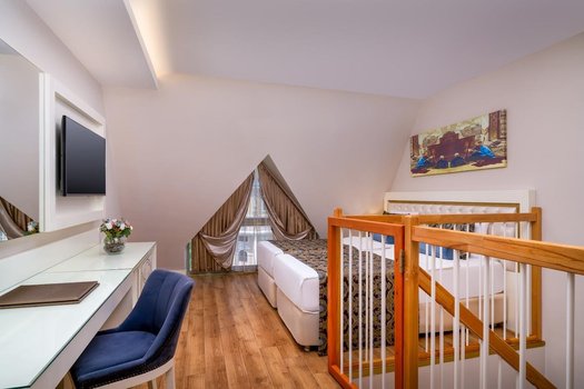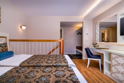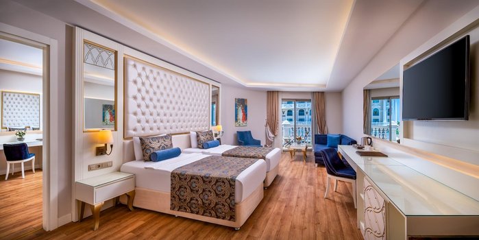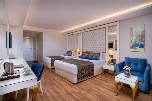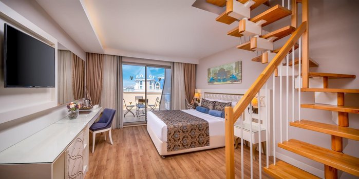 Этот отель расположен в районе Тюрклер и подойдет для семейного отдыха. Гости размещаются в семиэтажном здании с восточным архитектурным стилем. Номера просторные и светлые, предлагаются как стандартные, так и семейные варианты. Отельный пляж отмечен наградой «Голубой флаг» и находится через дорогу. До него можно дойти через подземный переход. Площадь пляжа составляет 5,460 м², берег песчано-галечный, а море чистое и спокойное. На пляже установлены душевые, кабинки для переодевания, есть зона с шезлонгами и зонтиками, ресторан с закусками и напитками, амфитеатр, аквапарк с 9 горками для взрослых и 5 горками для детей, а также надувной аттракцион Wet Bubble. На территории отеля расположены большой открытый бассейн (1793 м²), инфинити-бассейн и полуолимпийский крытый бассейн. Питание организовано по системе «ультра все включено». Основной ресторан предлагает блюда турецкой и европейской кухни в формате шведского стола. Дополнительно работают 4 ресторана а ля карт, 2 снэк-ресторана и 6 баров. В главном ресторане есть отдельный детский зал со шведским столом, подогреватели для бутылочек и высокие стульчики. Для детей предусмотрен клуб с занятиями по живописи, тематическими играми и спортивными соревнованиями. Рядом находится бассейн для малышей и игровая площадка на свежем воздухе. Вечером для детей устраивают мини-диско. Родителям по запросу предоставляются услуги няни и аренда детских колясок. Взрослые могут заниматься пляжным волейболом, бочча, теннисом, ходить в турецкую баню, сауну, посещать массаж и СПА-процедуры, а также заниматься в фитнес-зале. В бассейне проводят занятия по аквааэробике. Вечерняя программа включает развлекательные шоу, дискотеки, пенные вечеринки и файер-шоу. На всей территории отеля доступен бесплатный Wi-Fi. Если гость остановится в этом отеле, утро начнется с завтрака в ресторане, после чего можно отправиться на пляж. Чистая вода и мягкий песчаный берег идеально подойдут для отдыха у моря. Дети наслаждаются аттракционами в аквапарке, пока взрослые расслабляются в СПА или играют в пляжный волейбол. Днем можно перекусить в снэк-ресторане или отдохнуть у бассейна. Вечером вся семья может поужинать в одном из ресторанов с блюдами международной кухни, а затем отправиться на развлекательное шоу или дискотеку. За пределами отеля в шаговой доступности находятся магазины, рынок и автобусная остановка, откуда легко добраться до Аланьи и других близлежащих достопримечательностей, таких как аквапарк Sealanya и Щаравсинский Каравансарай.